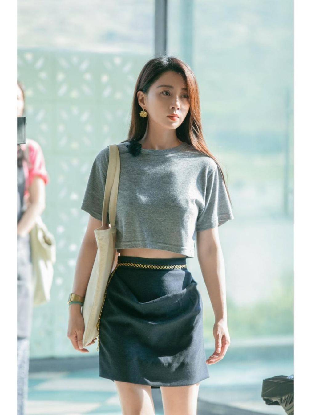 当上身穿着灰色衣服时,下身的裤子或裙子可以大胆尝试黑色。裙子可谓是中年女性的心头好,每个女生的衣柜里都少不了几条。殷桃所穿的这款裙子设计独特,腰部融入金色链条设计,巧妙地将注意力吸引到小蛮腰上。小肚子处的面料采用多层设计,层次感十足。脚上的运动鞋有一定厚度,适合春秋冬三季气温较低时穿着,夏天则最好在空调房里穿,否则脚部容易闷热。